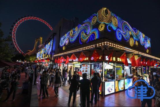 内容提要:摩天轮夜市是天津的夜市中最有特色的一个,因为独特的地理位置,市民们既能欣赏美景,又能品尝美食,因此夏天人气极旺。