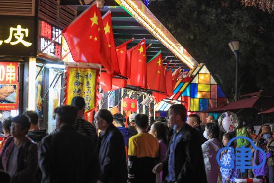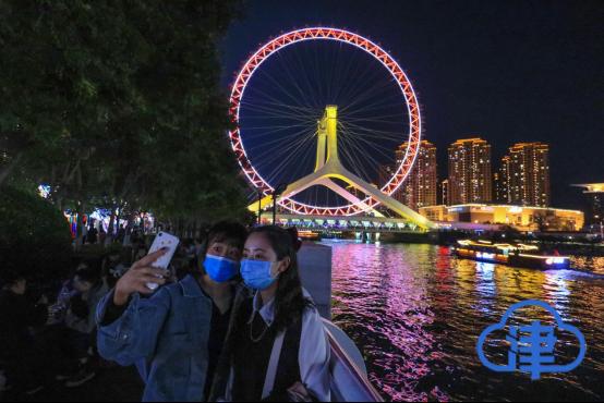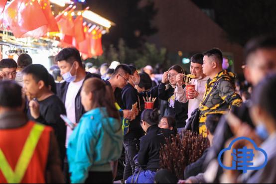 天津北方网讯:摩天轮夜市是天津的夜市中最有特色的一个,因为独特的地理位置,市民们既能欣赏美景,又能品尝美食,因此夏天人气极旺。国庆期间,虽然气温下降明显,但是摩天轮夜市人气几乎不减反增。晚霞尚未退尽,夜市已是灯火通明,人声鼎沸,所有商铺全部火力全开。许多外地游客慕名前来,在摩天轮下拍照打卡,流连忘返。(津云新闻记者吴涛)