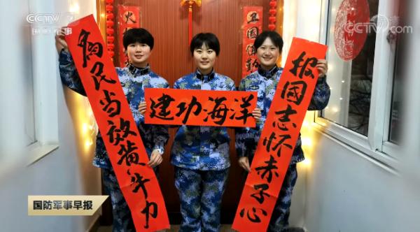 我们常说,年三十,贴对子。这一天,春联一定是最具代表性的元素了。官兵们也自创了很多军味十足的对联。我们来看这副春联,上联是:卸红装白衣天使,下联是:戴蓝盔卫勤尖兵,横批:不忘初心。这是万里之外第八批赴马里维和医疗分队官兵写下的春联。我们再来看这副东部战区海军航空兵某部通信女兵连写下的春联,上联是:为民当效黄牛力,下联是:报国志怀赤子心,横批:建功海洋。这些充满军味、战味的春联可都是官兵们自己写出来的。军营里的年味儿可不止写春联,还有哪些好玩的?咱们一起去看。