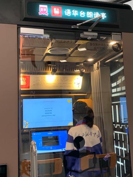 在一处教学楼的进门处,记者还看到了学校设置的朗读亭,“在朗读亭里,可满足师生交互式的朗读体验。实现了阅读内容、阅读情境、阅读层次、阅读方式的智能优化,实现了从‘浅阅读’到‘智慧阅读’的转化。”一位老师告诉记者。