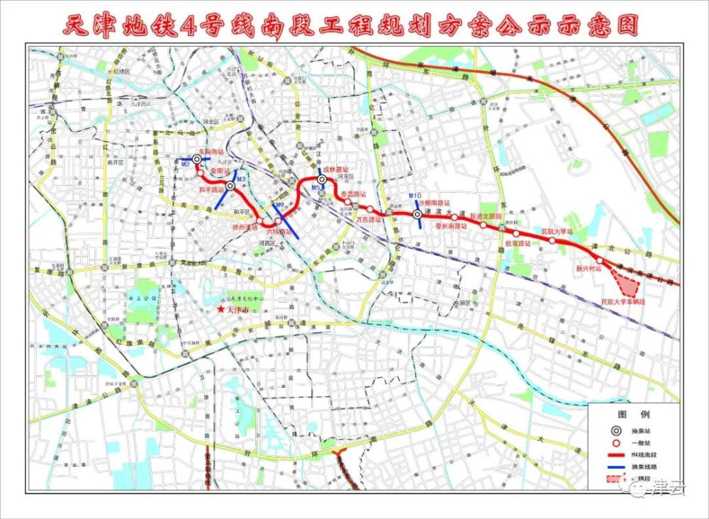 据了解,天津地铁4号线南段工程线路北起东南角站,南至东丽区新兴村,沿线经过南开、和平、河西、河东、东丽5个行政区,全长19.4公里,设14座车站,均为地下站,车站自西向东以此为东南角站(与2号线换乘)、金街站、和平路站、徐州道站、六纬路站、成林道站(与5号线换乘)、泰昌路站、万东路站、沙柳南路站(与10号线换乘)、登州南路站、跃进北路站、航双路站、民航大学站、新兴村站。