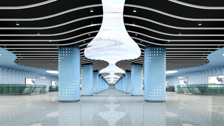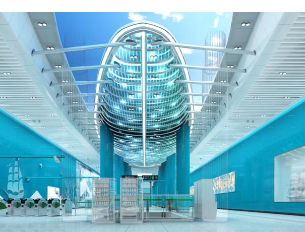 泰昌路站通过采用投影全景式天花、方通组合墙面等造型,展现天津独具魅力的国际商贸中心和国际性时尚消费之都特色。