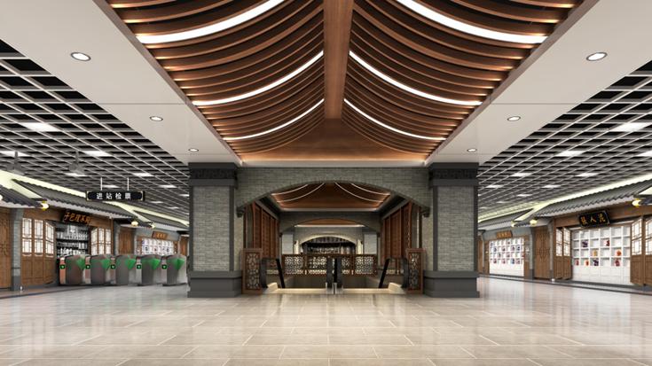 徐州道站主打木纹铝板造型门,墙面金属花格、墙面造型柜、仿古文化砖,墙面橱窗展示以天津老字号商业发展史为艺术创作题材对空间进行塑造,展现天津商业的繁荣景象和百年历程。