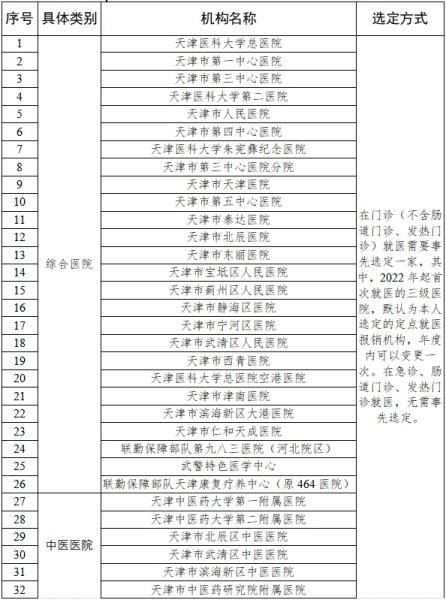 (二)参保居民在本市三级综合医院、中医医院、中西医结合医院的急诊、肠道门诊、发热门诊以及在本市三级专科医院(含海河医院)门(急)诊就医,无需事先选定一家作为定点就医报销机构,发生的费用居民医保按规定报销。