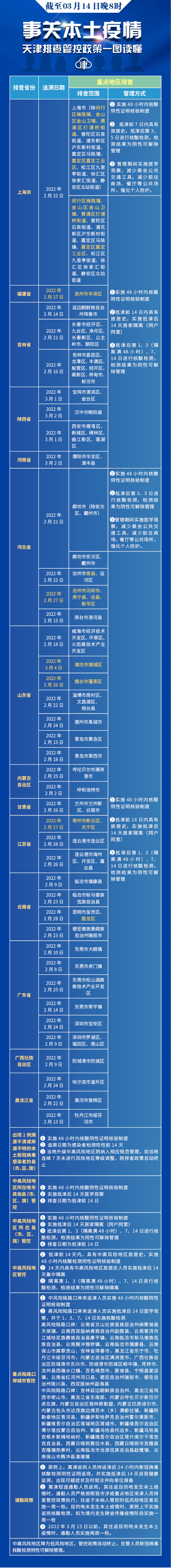 新增具有2022年2月22日(含)以来途经上海市闵行区梅陇镇、金山区金山卫镇、黄浦区打浦桥街道、普陀区石泉街道、浦东新区沪东新村街道、嘉定区马陆镇、嘉定区嘉定工业区、松江区九里亭街道、徐汇区徐家汇街道、静安区北站街道,新增具有2022年2月27日(含)以来途经福建省泉州市丰泽区,新增具有2022年2月22日(含)以来途经河北省沧州市青县,新增具有2022年2月27日(含)以来途经河北省沧州市河间市、肃宁县、沧县、新华区,新增具有2022年3月4日(含)以来途经山东省潍坊市潍城区,新增具有2022年2月26日(含)以来途经山东省烟台市蓬莱区,新增具有2022年2月27日(含)以来途经江苏省常州市新北区、天宁区,新增具有2022年2月28日(含)以来途经云南省昆明市盘龙区旅居史的来津及返津人员,需持48小时内核酸阴性证明或出示包含核酸检测阴性信息的健康码“绿码”,主动向社区、工作单位等报备,抵津前14日内具有旅居史,实施抵津后14天居家隔离(同户同室)。