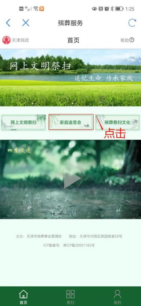 市民可通过天津市民政局官网、“津心办”APP、“天津殡仪服务”微信公众号三种方式进入天津网上祭扫平台,具体操作方式如下: (一)天津市民政局官网进入方式:登录市民政局官网(http://mz.tj.gov.cn/)→点击下方“专题专栏”→点击“网上文明祭扫”或点击:殡葬服务→网上办理→网上祭扫。 (二)“津心办”APP进入方式:下载津心办APP→首页下滑点击“旗舰店”→“民政局”→“殡葬服务”→“网上祭扫”。 (三)微信公众号进入方式:搜索“天津殡仪服务”微信公众号并关注→点击下方“服务办理”→点击“网上祭扫”。