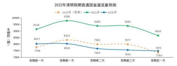 预计清明假期普通国省道日均断面交通量约为8000-8100辆,同比2021年(9518辆)下降14%-16%,同比2020年(7741辆)上升3%-5%,如图4所示。