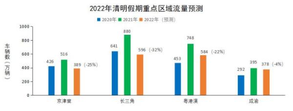 长三角区域。近期由于上海、江苏与浙江的疫情形势较为严峻,封控范围较大,清明期间出行量预计将显著减少,高速公路日均流量约600万辆,同比2021年下降32%左右,同比2020年下降7%左右,如图7所示。长三角区域出行高峰预计为假期第一天和第三天。由于祭扫、探亲和踏青等需求仍然存在,长三角区域出行相对集中,区域内大中城市进出口收费站及临近路段拥堵缓行发生概率较高。江苏、浙江、安徽的主要拥堵节点集中在纵向和横向大通道。
