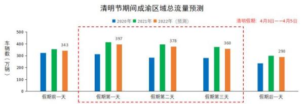 成渝地区。清明期间预计成渝区域日均流量约为380万辆,同比2021年下降4%左右,同比2020年上升29%左右,如图9所示。清明期间,以川渝之间中、短途集中出行为主,占比超过总出行量的50%。假期首日是流量高峰,预计超过400万辆,之后流量呈逐日下降趋势。高速公路流量较大的路段和繁忙的高速公路服务区及收费站多集中在成都市区和重庆主城区及其相关放射线。