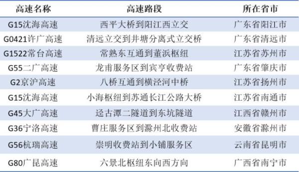 易拥堵缓行路段。预计全国高速公路易发生拥堵缓行路段主要有:G2京沪高速江苏扬州段,G15沈海高速广东阳江段、江苏南通段,G36宁洛高速安徽滁州段,G45大广高速江西赣州段,G55二广高速广东肇庆段,G56杭瑞高速云南昆明段,G80广昆高速广西南宁段,G0421许广高速广东清远段,G1522常台高速江苏苏州段等。如表1所示。