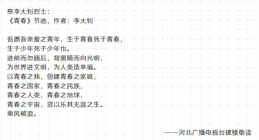 李大钊创建青春中华的理想经久不衰,如今青春已被演绎成歌,被当代青年传唱。李大钊一生追求革命真理,追求民族独立和人民解放,始终把个人生死置之度外。他生前曾撰写名联“铁肩担道义,妙手著文章”。