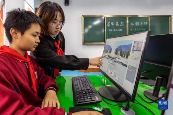 4月1日,在贵州省黔西市惠风学校,老师指导学生通过网络祭奠烈士。 清明将至,人们来到烈士陵园,或通过英烈网,祭奠和缅怀先烈。 新华社发(范晖摄)