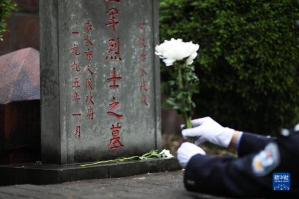 4月1日,在贵州省赤水市红军烈士陵园,民警向红军烈士墓敬献鲜花。 清明将至,人们来到烈士陵园,或通过英烈网,祭奠和缅怀先烈。 新华社发(王长育摄)