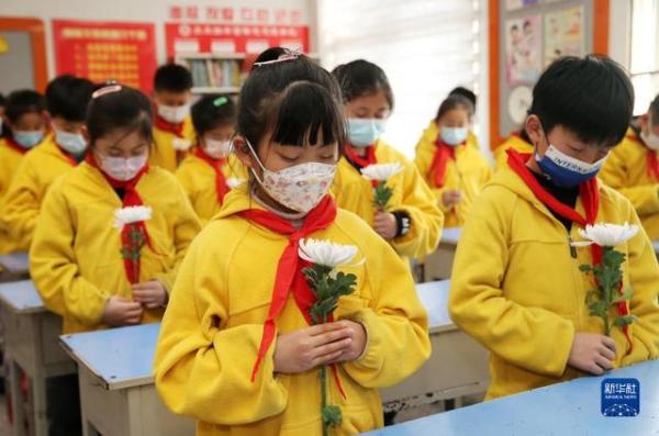 4月1日,在山东省聊城市茌平区菜屯镇中心小学,学生手持鲜花参加“清明祭英烈”线上活动。 清明将至,人们来到烈士陵园,或通过英烈网,祭奠和缅怀先烈。 新华社发(赵玉国摄)