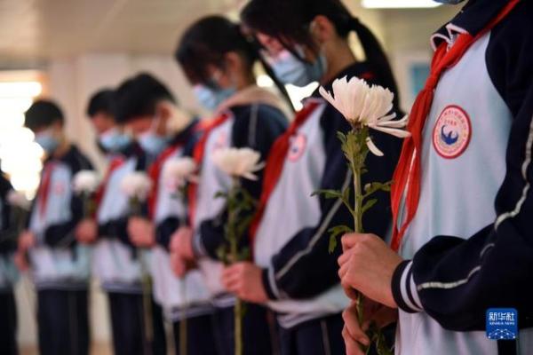 4月1日,安徽省淮北市首府实验小学学生手持鲜花通过教学网络向英烈默哀。 清明将至,人们来到烈士陵园,或通过英烈网,祭奠和缅怀先烈。 新华社发(万善朝 摄)