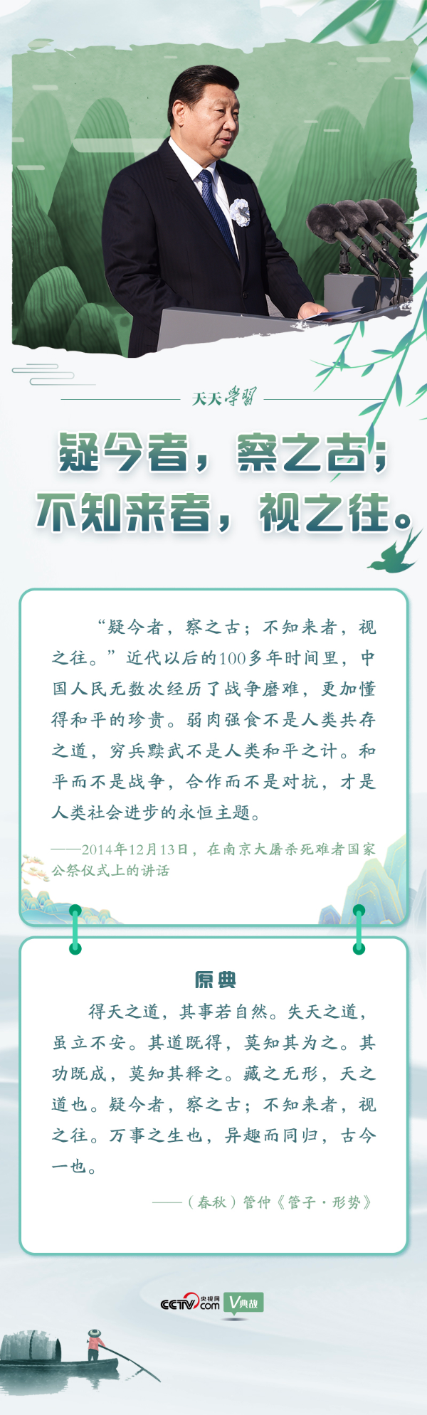 党的十八大以来,习近平总书记在多个场合讲述英雄事迹、致敬英雄精神,并引用爱国主义诗句言志抒怀,强调要铭记历史、缅怀先烈、珍爱和平、开创未来。在清明节到来之际,央视网《天天学习》与您一起学习领会总书记用典。