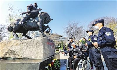 和平区花园路社区组织居民、退伍军人等向吉鸿昌将军雕像献花。本报记者 吴迪 摄