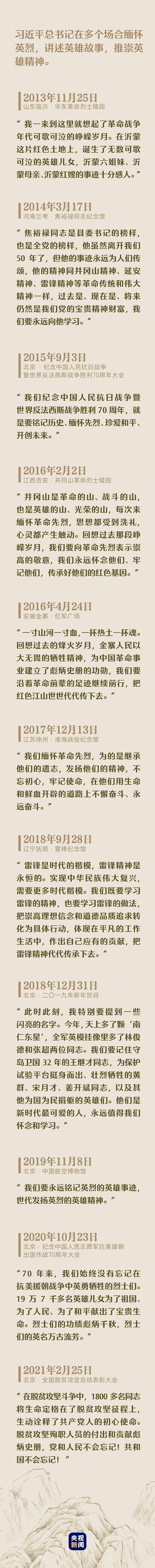 “中华民族是崇尚英雄、成就英雄、英雄辈出的民族,和平年代同样需要英雄情怀。”党的十八大以来,习近平总书记在多个场合缅怀英烈,讲述英雄故事,推崇英雄精神,激励在全社会树立崇尚英雄、缅怀先烈的良好风尚。