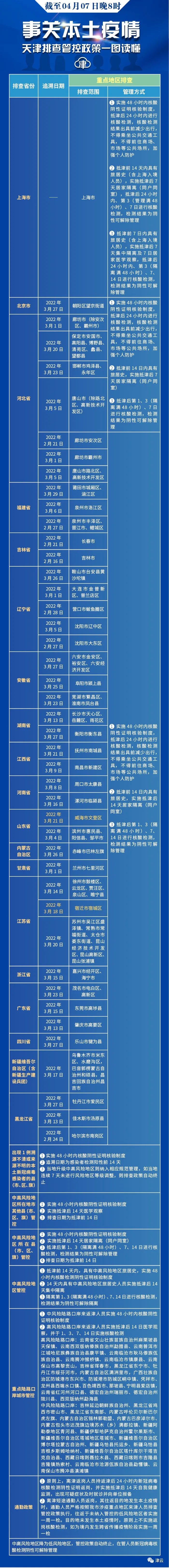 相关人员主动报备。 新增具有2022年3月21日(含)以来途经山东省威海市文登区,具有2022年3月18日(含)以来途经江苏省宿迁市宿城区的来津及返津人员需持48小时内核酸阴性证明或出示包含核酸检测阴性信息的健康码“绿码”,主动向社区、工作单位等报备,实施48小时内核酸阴性证明核验制度,抵津后24小时内进行核酸检测,核酸检测结果出具前减少出行,不得乘坐公共交通工具,不得前往商场、市场等公共场所,加强个人防护。抵津前14日内具有旅居史,实施抵津后14天居家隔离(同户同室)。