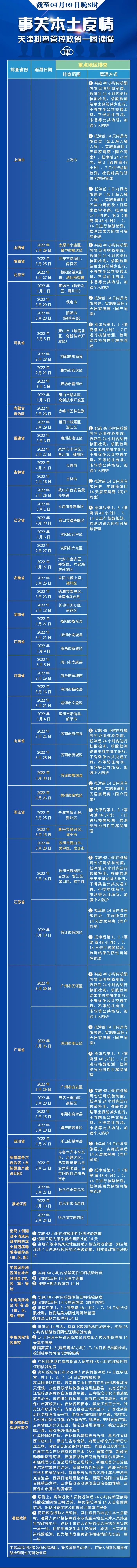 相关人员主动报备。新增具有2022年3月29日(含)以来途经山西省太原市小店区、晋中市榆次区,具有2022年3月27日(含)以来途经北京市朝阳区酒仙桥街道,具有2022年3月30日(含)以来途经山东省菏泽市鄄城县,具有2022年3月25日(含)以来途经浙江省杭州市余杭区,具有2022年3月15日(含)以来途经浙江省嘉兴市经开区、海宁市,具有2022年3月20日(含)以来途经江苏省苏州市昆山市、吴中区、太仓市,具有2022年3月29日(含)以来途经广东省广州市天河区,具有2022年3月26日(含)以来途经广东省深圳市南山区的来津及返津人员需持48小时内核酸阴性证明或出示包含核酸检测阴性信息的健康码“绿码”,主动向社区、工作单位等报备,实施48小时内核酸阴性证明核验制度,抵津后24小时内进行核酸检测,核酸检测结果出具前减少出行,不得乘坐公共交通工具,不得前往商场、市场等公共场所,加强个人防护。抵津前14日内具有旅居史,实施抵津后7天居家隔离(同户同室)。