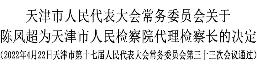 根据《中华人民共和国地方各级人民代表大会和地方各级人民政府组织法》第五十条和《天津市人民代表大会常务委员会人事任免办法》第十条规定,天津市第十七届人民代表大会常务委员会第三十三次会议决定:陈凤超为天津市人民检察院代理检察长,报全国人民代表大会常务委员会和最高人民检察院备案。