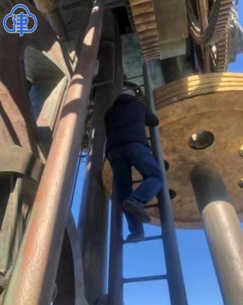 座落于天津站前广场的世纪钟,始建于2000年,作为天津市最具关注度的城雕建筑之一,屹立在海河之畔见证着这座城市发展与变革。光阴荏苒,作为全金属材料的世纪钟经历了20余年的风霜雪雨,锈蚀和老化情况也日趋严重。近期,河东区城管委工作人员在例行安全巡查中发现钢制平台的底面及外侧出现了较严重的锈蚀破损,但具体破损的位置、程度需要登上世纪钟进入它的内“芯”才能确定。