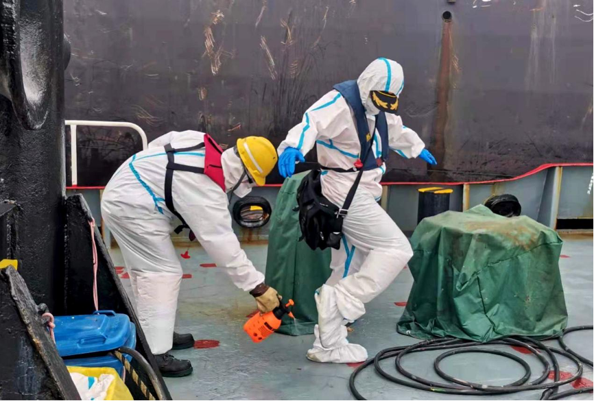 烈日在上,海水在下,在防护服严密包裹下的一群人他们如置身蒸笼,湿热难耐。完成任务后,脱下防护服,里面的衣服已经全身湿透,戴了几个小时的医用橡胶手套和皮肤仿佛已经粘连在了一起,摘下手套都变得困难,由于手在汗水中浸泡时间过长,整个手掌已经泛白、起皱,甚至过敏……这样的情形就是天津港引航员们的工作日常。