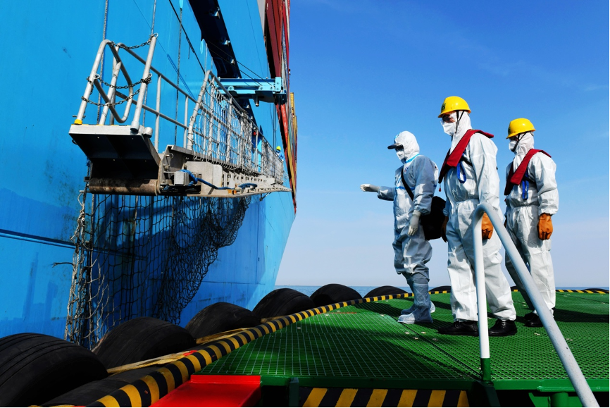 在高温下坚守,在暴雨中逆行,坚决落实防疫政策,全天候引领船舶进出港,他们用汗水和无畏彰显了“水上国门形象第一人”的风采与担当。
