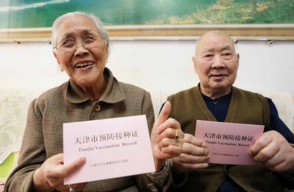 红桥区咸阳北路街道彰武社区住着92岁的夏桐兰奶奶和98岁的季洪金爷爷,两位老人虽年近百岁,但身体倍儿棒,听说社区组织60岁以上老年人接种疫苗,便积极报名参加。夏桐兰老人说:“作为一名老党员,支持防疫工作,我们可不能掉队。”