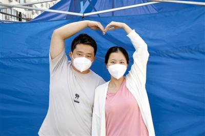 图为申向阳和王晓萌在核酸采样工作后合影。(北辰区宜兴埠镇供图)