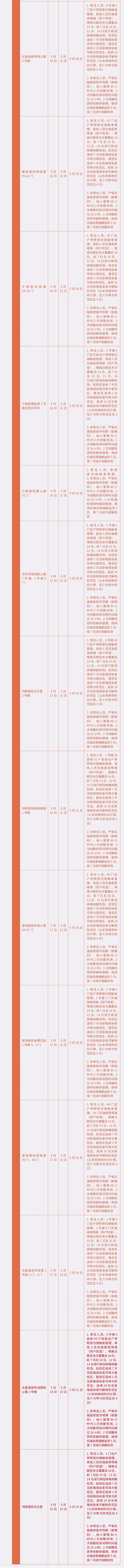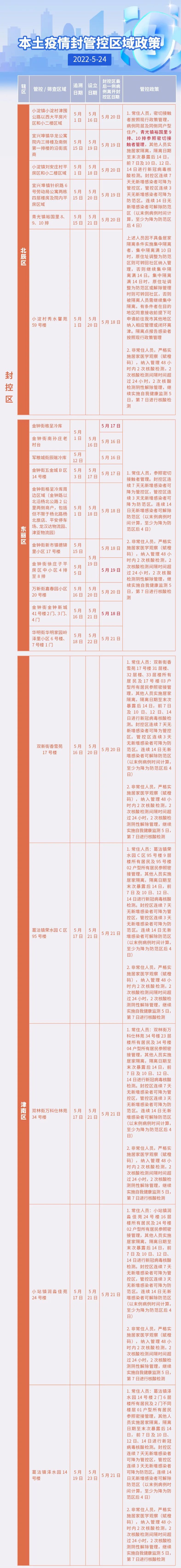 管控区新增具有5月18日(含)以来途经河东区靖泰里2号楼除2门外、1号楼、3号楼,河东区常州里51号楼除1门外,河东区益寿东里14号楼1门、17号楼3门、37号楼6门,河东区金湾花园东区6号楼除7门外旅居史的常住人员,严格实施居家隔离(同户同室)。非常住人员,严格实施居家医学观察(赋橙码)。