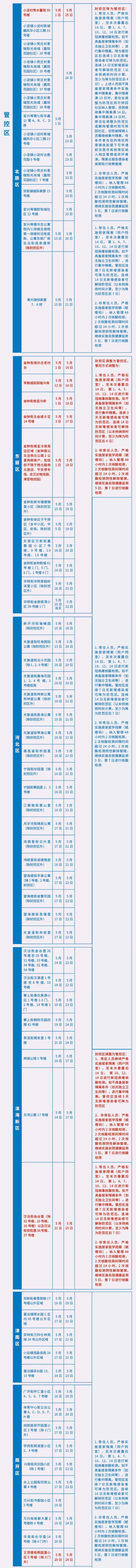 管控区新增5月18日(含)以来途经河东区靖泰里2号楼除2门外、1号楼、3号楼,常州里51号楼除1门外,益寿东里14号楼1门、17号楼3门、37号楼6门,金湾花园东区6号楼除7门外;5月19日(含)以来途经红桥区铃铛阁街西关北里53-79门;5月20日(含)以来途经王顶堤街燕园里小区5号楼(除3门外),河西区柳林街昌源公寓6号楼16门;5月21日(含)以来途经滨海新区汉沽街金谷里(除32号楼、10号楼、16号楼)以及汉沽街安阳里36号楼、37号楼区域旅居史的常住人员,严格实施居家隔离(同户同室)。非常住人员,严格实施居家医学观察(赋橙码)。