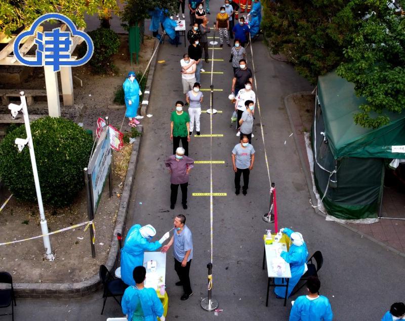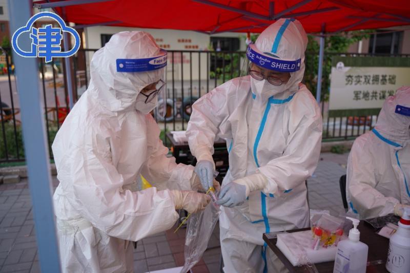红桥区和苑街道营和园社区、河北区月牙河街满江北里社区正有序高效进行着采样工作,医护人员娴熟转动拭子,轻车熟路地完成了样品采集,随着采样拭子折断在试管内,样品“神秘”的旅途就此开启,贴签、装袋、封口。