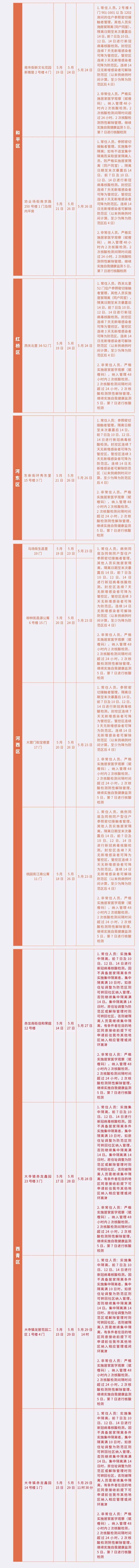 管控区调整为防范区,管控方式调整为:新增具有5月15日(含)以来途经河北区新开河街瑜峰园小区;具有5月17日(含)以来途经河北区望海楼街孚泰公寓(除1号楼、2号楼、管控区)、金蕾花园(除管控区外)、昆璞里(除管控区外),光复道街林容里(除管控区外);新增具有5月19日(含)以来途经滨海新区寨上街朝阳花园四期42号楼;具有5月21日(含)以来途经茶淀街雅安里1号楼旅居史的常住人员非必要不离开防范区,非常住人员,严格实施居家医学观察(赋橙码)。
