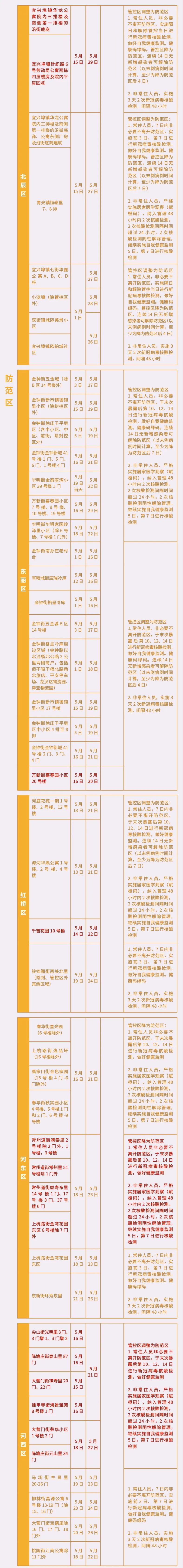 管控区调整为防范区,管控方式调整为:新增具有5月15日(含)以来途经北辰区宜兴埠镇华龙公寓院内三排楼及南侧第一排楼的沿街底商、北辰区宜兴埠镇针织路6号劳动局公寓两栋四层楼房及院内平房区域,具有5月16日(含)以来途经东丽区万新街嘉春园小区20号楼旅居史的常住人员,非必要不离开防范区,非常住人员,实施3天2次新冠病毒核酸检测,间隔48小时。