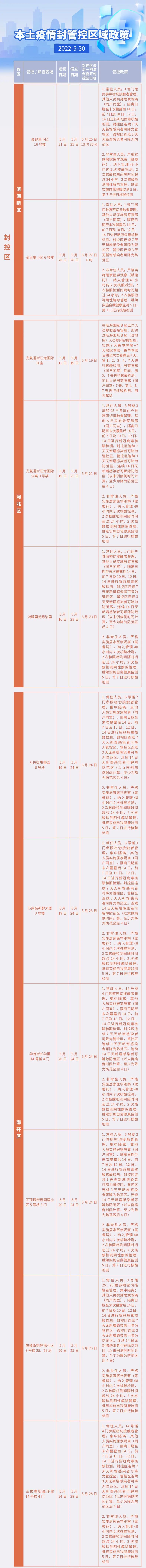 管控区调整为防范区,管控方式调整为:具有5月16日(含)以来途经和平区新兴街云汉楼、清华园A座,津南区双新街香雪苑17号楼旅居史的常住人员非必要不离开防范区,非常住人员,实施3天2次新冠病毒核酸检测,间隔48小时。