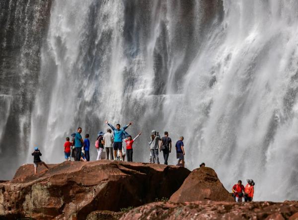 8月3日,游客在赤水丹霞旅游区大瀑布游玩。新华社发(胡攀学摄)