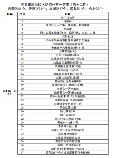 根据当前海南省三亚市疫情防控工作需要,按照国务院应对新型冠状病毒肺炎疫情联防联控机制综合组《新型冠状病毒肺炎防控方案(第九版)》相关规定,经专家组研判,三亚市疫情防控指挥部决定,高风险区域调整为90个、中风险区域调整为25个。