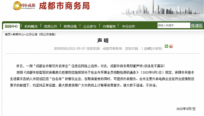 内容提要:成都市商务局网站9月7日发表声明称,昨日,一则“成都全市餐饮外卖停业”信息在网络上流传。对此,成都市商务局郑重声明:该消息不属实!
