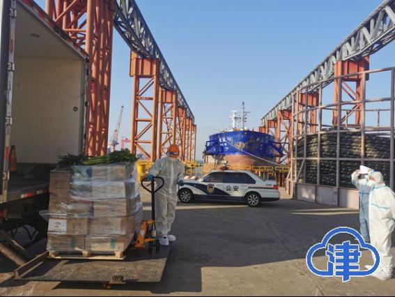 此次运送的物资包括淡水、肉类、新鲜蔬菜、水果等。塘沽边检站民警协调保障部门专门配送了月饼,让船员们品尝到中秋的味道。