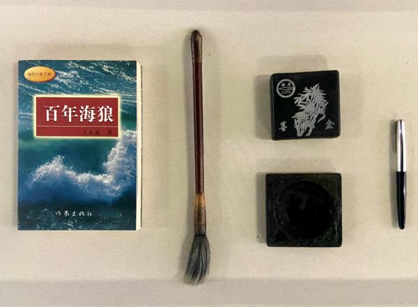 王家斌作品《百年海狼》及使用过的毛笔、墨盒、砚台、钢笔