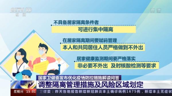 国务院联防联控机制11日发布关于进一步优化新冠肺炎疫情防控措施、科学精准做好防控工作的通知,通知明确了进一步优化防控工作的二十条措施。今天(11月13日),国家卫生健康委发布《关于进一步优化新冠肺炎疫情防控措施 科学精准做好防控工作的通知》解读问答,对《通知》出台的背景、优化和调整的具体内容等进行了详细解读。先来看看对隔离管理及风险区域划定方面的调整。