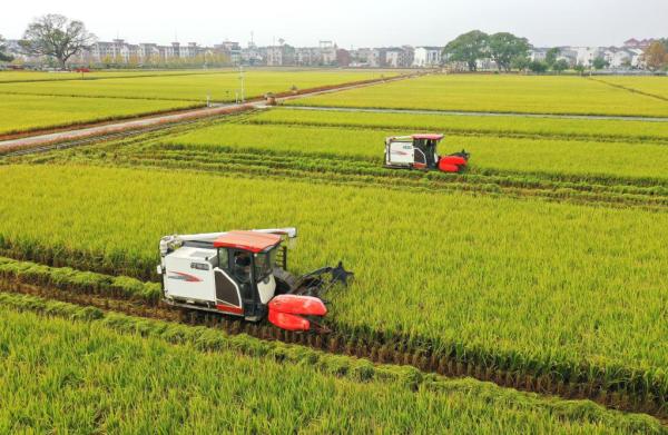 收割机在浙江省东阳市城东街道寀卢村共享田园里收割晚稻(11月21日摄,无人机照片)。新华社发(包康轩摄)