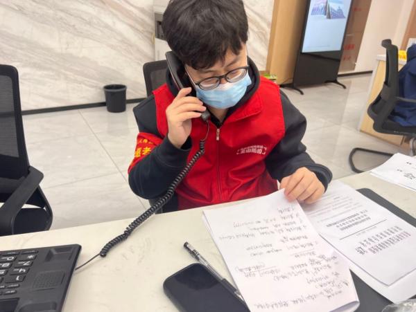 金山街道奥园十期居家党员就地上岗,到社区服务大厅值班,接听民生热线。通讯员 甘甜甜 摄