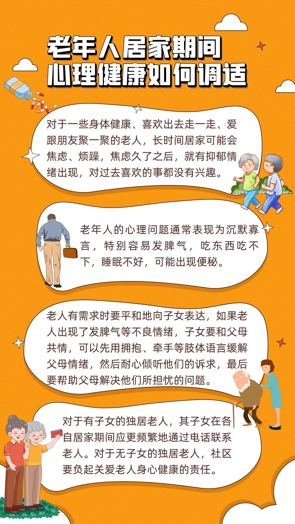 专家还表示,要特别关照独居老人的心理健康。对于有子女的独居老人,其子女在因疫情而各自居家期间应该更加频繁地通过电话联系老人,了解生活所需,安慰他们的情绪。对于无子女的独居老人,社区要负起关爱老人身心健康的责任。