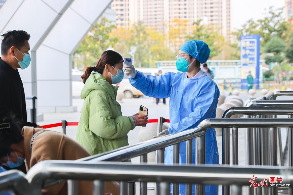 11月14日,在江苏省连云港市赣榆区人民医院预检分诊处,一名护士为前来就诊的市民测量体温。(司伟摄/光明图片)