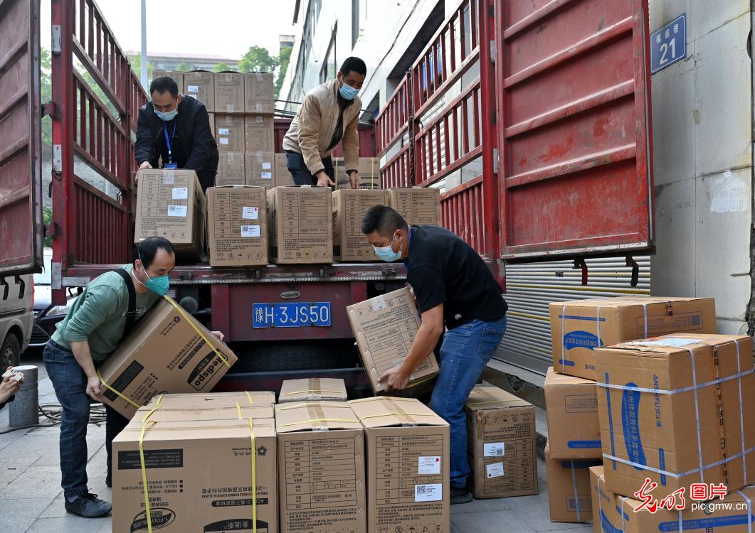 11月27日,四川省内江市东兴区西林街道抗疫人员正在领取疫情防控物资。 (李建明摄/光明图片)