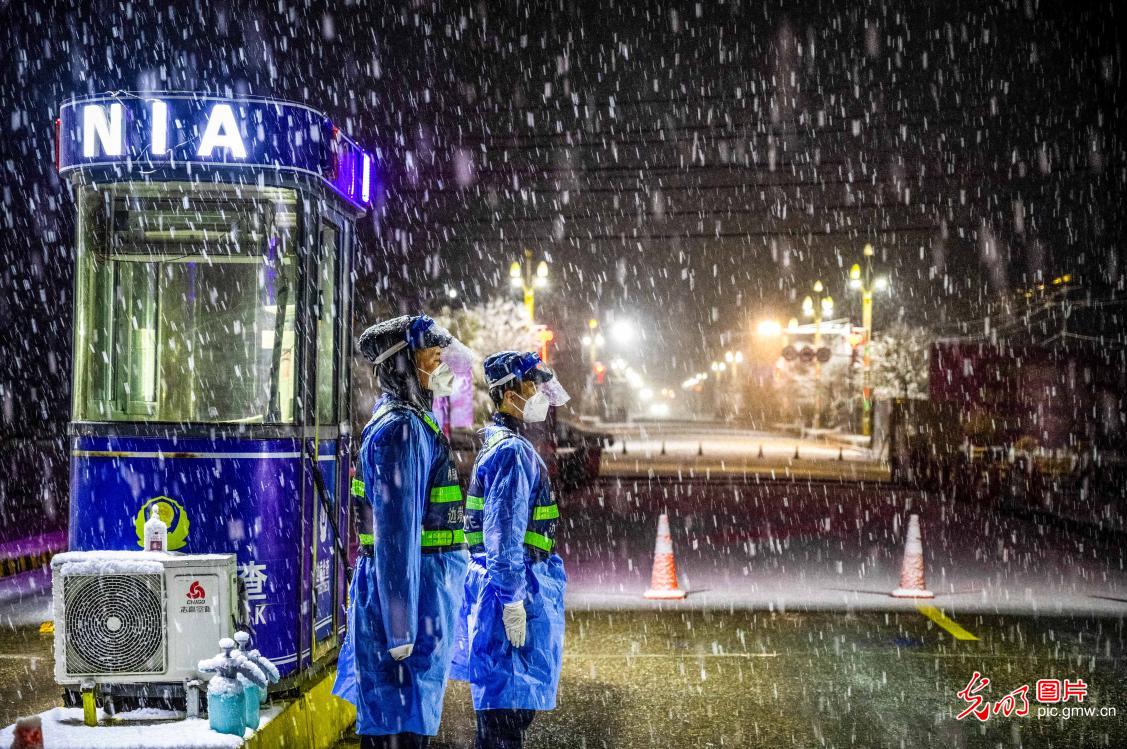 11月23日,执勤民警雪夜中坚守执勤岗位。 (王鹏飞摄/光明图片)