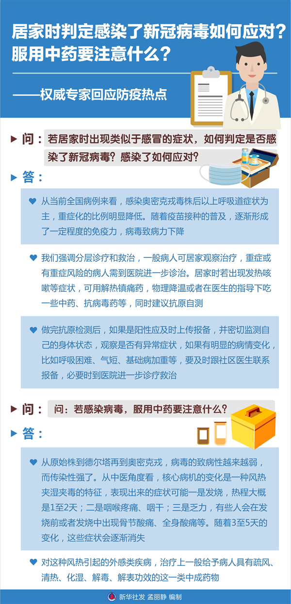 奥密克戎病毒致病性在减弱,若居家时出现类似于感冒的症状,如何判定是否感染了新冠病毒?若感染,服用中药要注意什么?国务院联防联控机制组织权威专家——首都医科大学附属北京中医医院院长刘清泉、北京大学第一医院感染科主任王贵强就公众关心的问题接受采访。