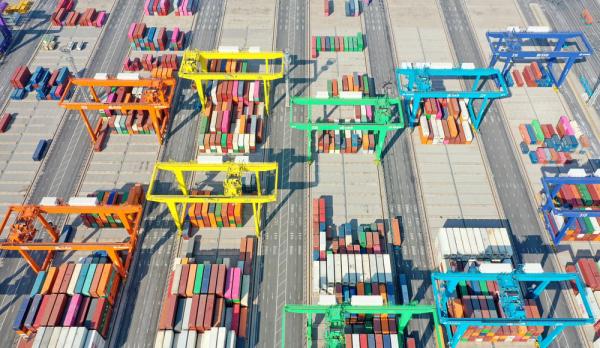 在天津港全物联网集装箱码头,场桥在堆场内吊运集装箱(无人机照片,2月21日)。新华社记者 赵子硕 摄